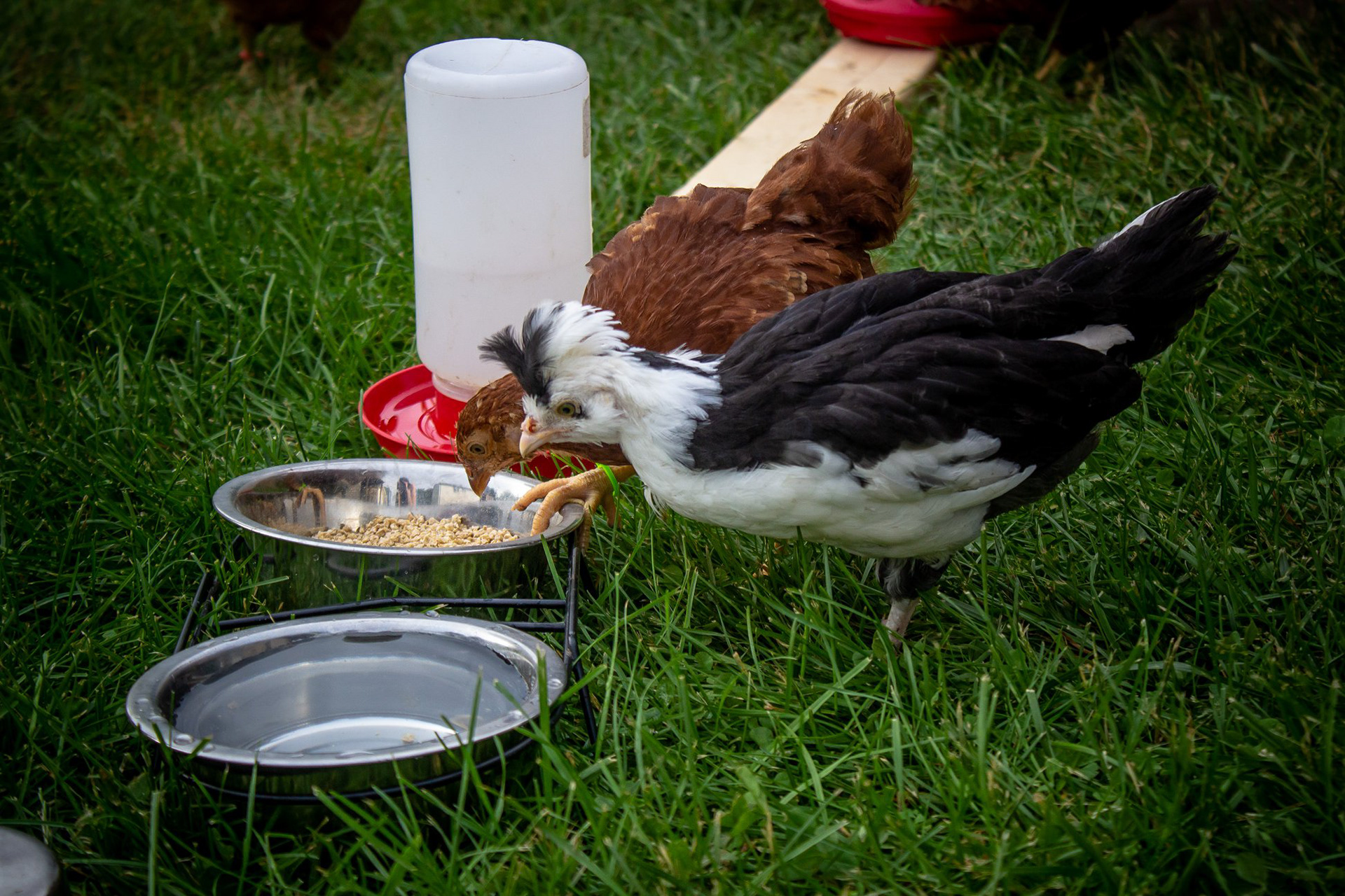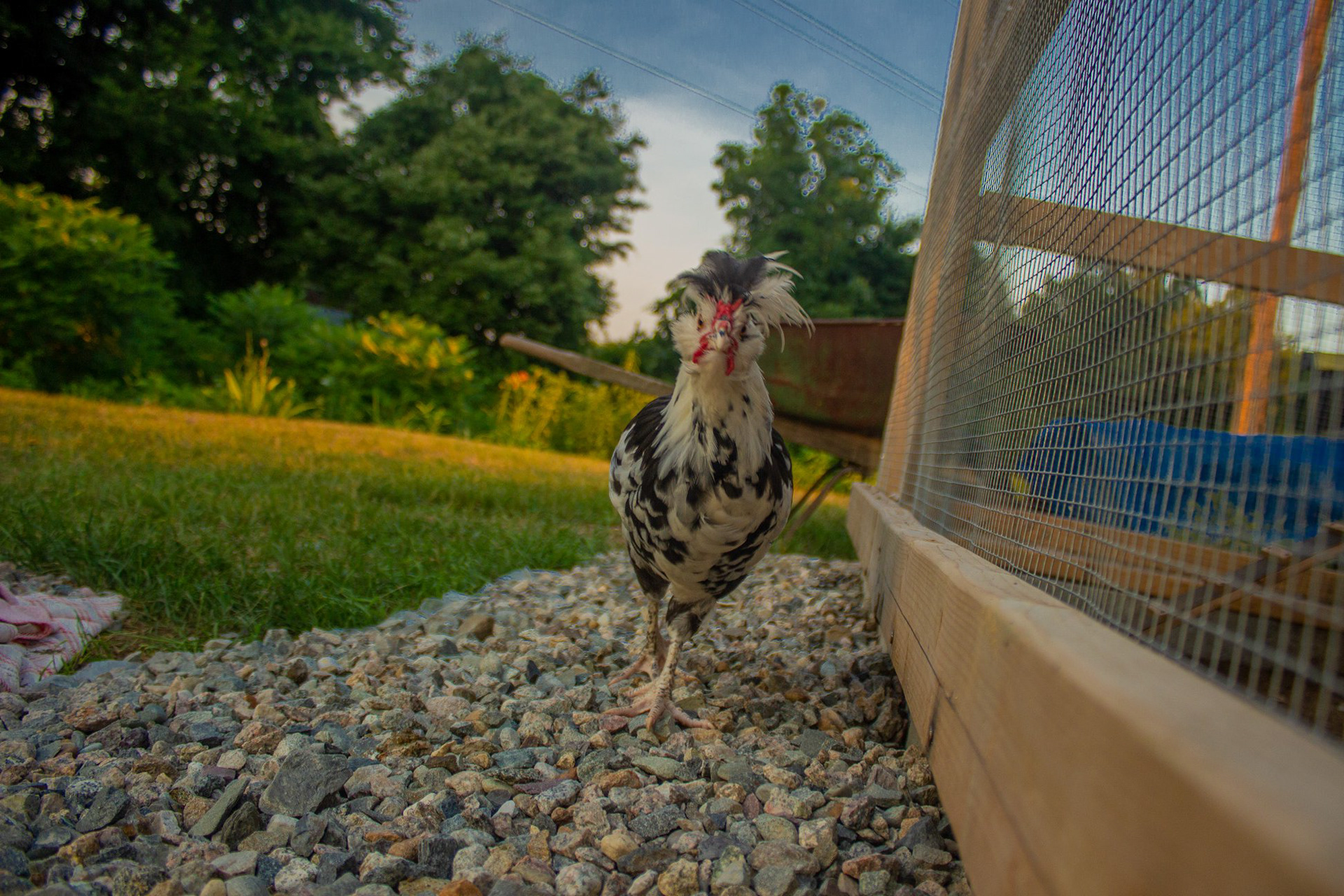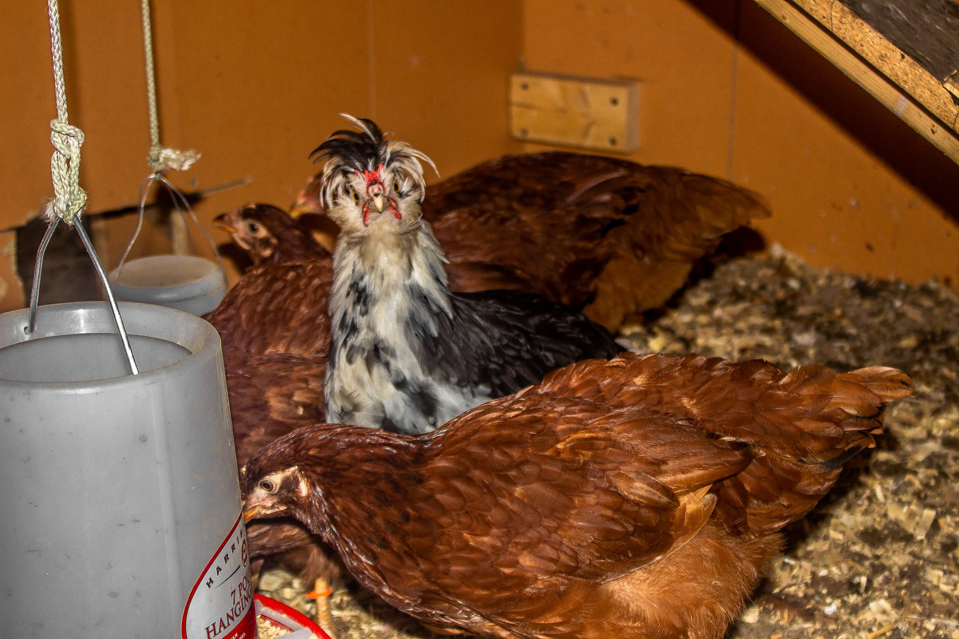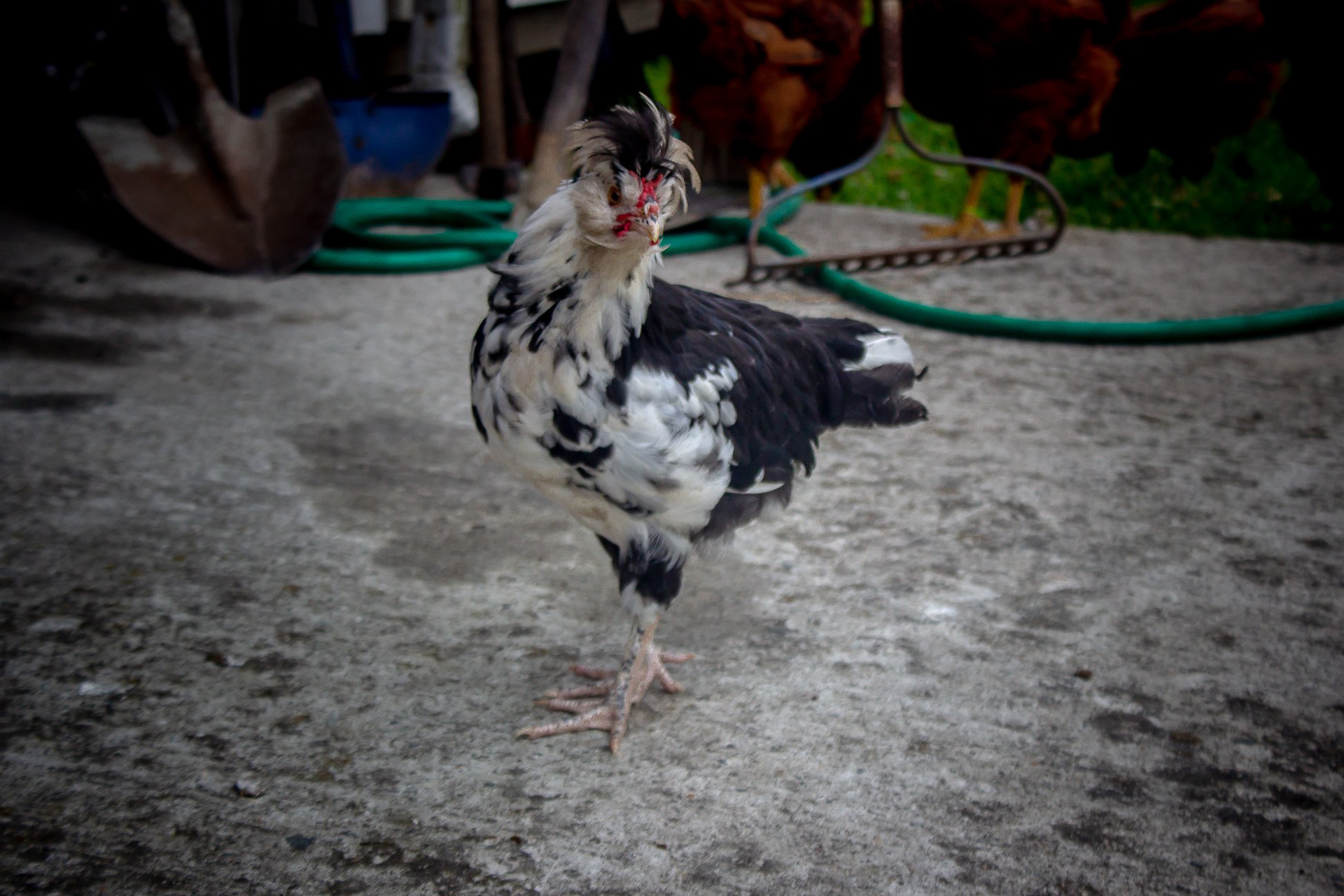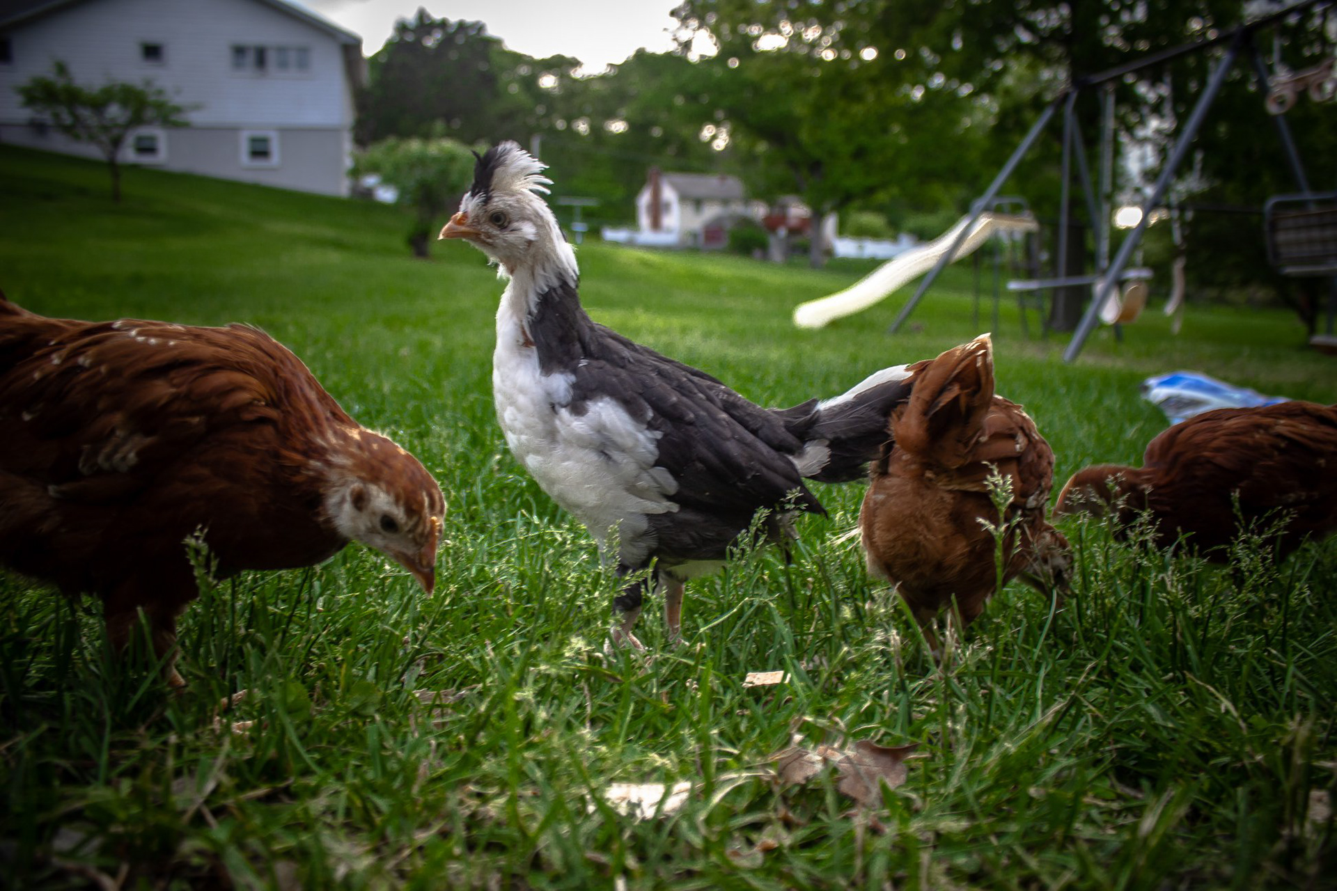 Silver Polish Rooster Chicken Breed with Rhode Island Reds